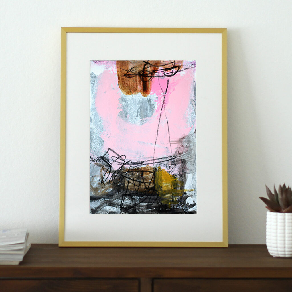 Original acrylic painting on paper in a beautiful brass-colored aluminum frame with passepartout. The front is made of plastic, which makes it safe to use. Bracket for hook on the back.