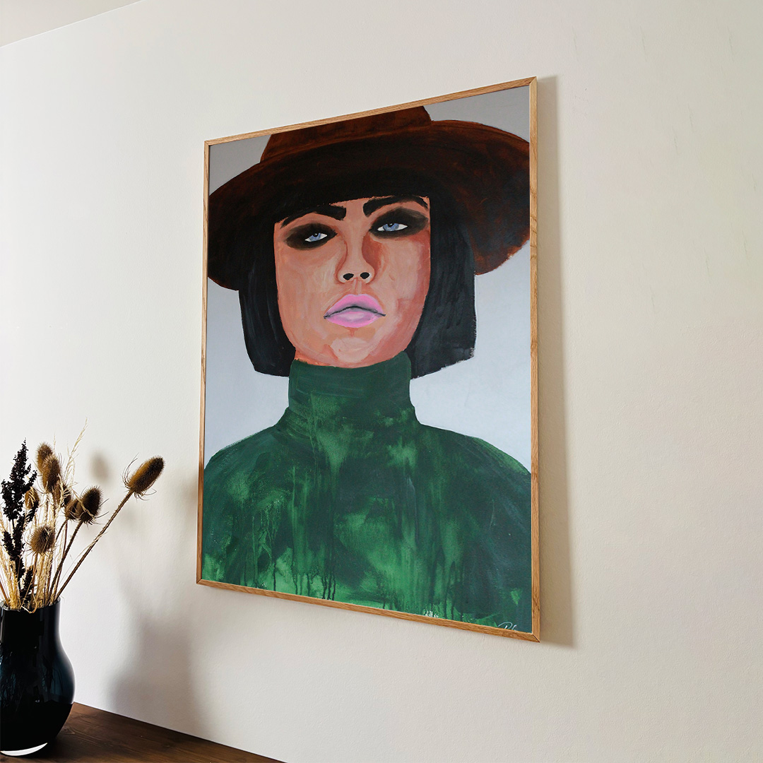 Original acrylic painting on paper in a beautiful oak frame. The front is made of crystal clear shatter-free acrylic glass, which makes it safe to use. Bracket for hook on the back.