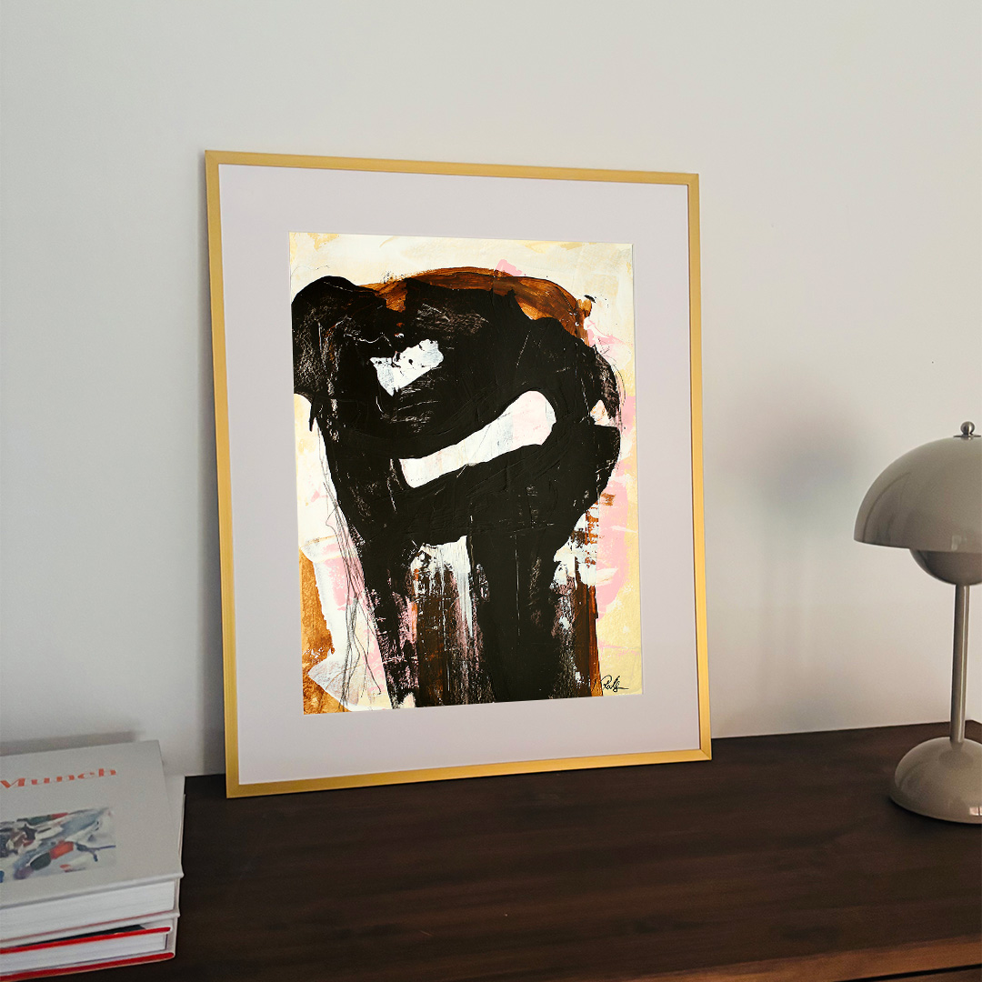 Original acrylic painting on paper in a beautiful brass-colored aluminum frame with passepartout. The front is made of plastic, which makes it safe to use. Bracket for hook on the back.