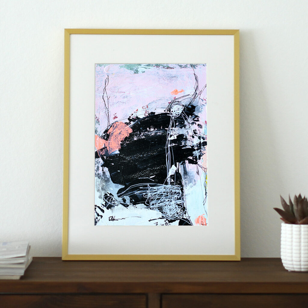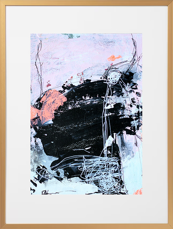 Original acrylic painting on paper in a beautiful brass-colored aluminum frame with passepartout. The front is made of plastic, which makes it safe to use. Bracket for hook on the back.