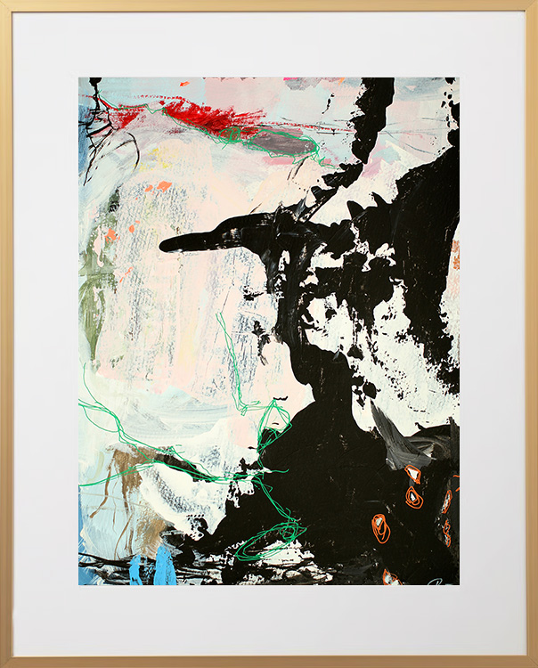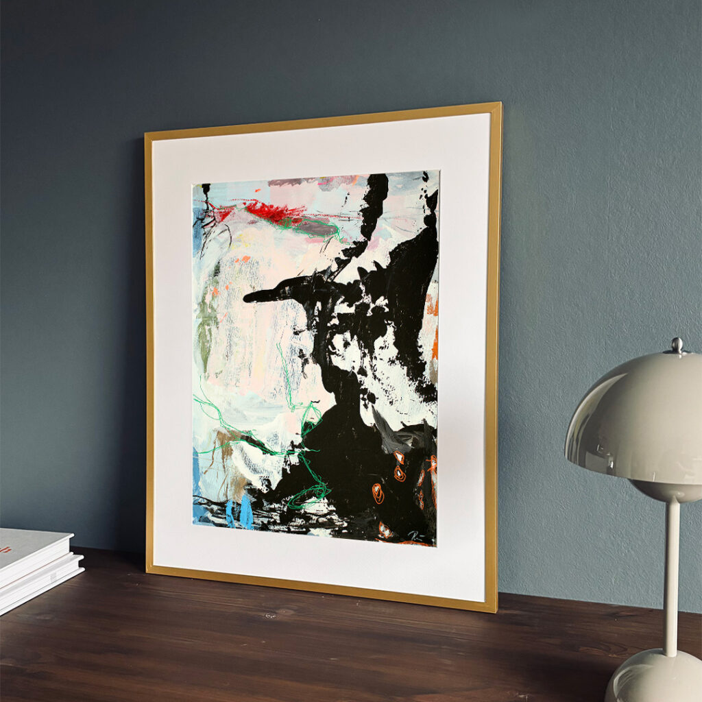 Original acrylic painting on paper in a beautiful brass-colored aluminum frame with passepartout. The front is made of plastic, which makes it safe to use. Bracket for hook on the back.