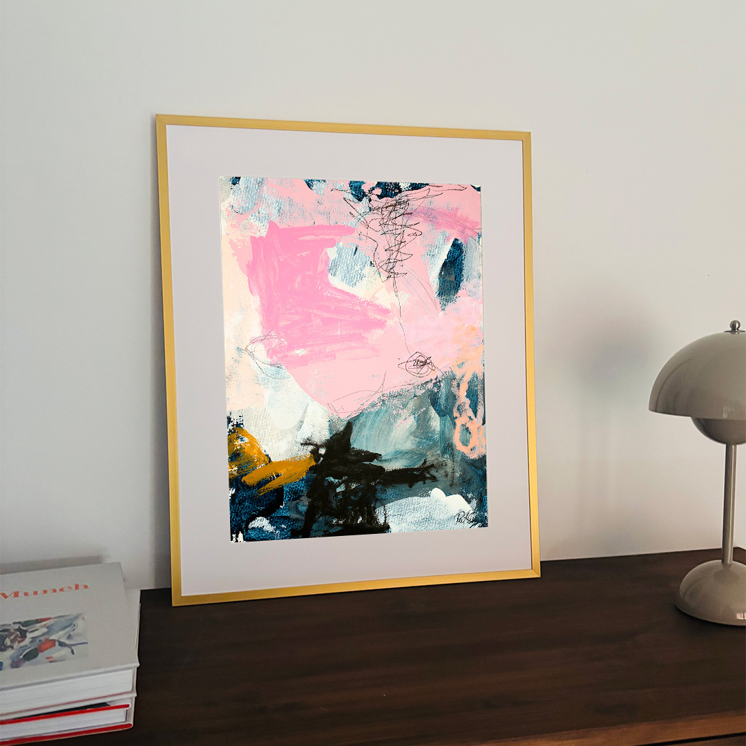 Original acrylic painting on paper in a beautiful brass-colored aluminum frame with passepartout. The front is made of plastic, which makes it safe to use. Bracket for hook on the back.