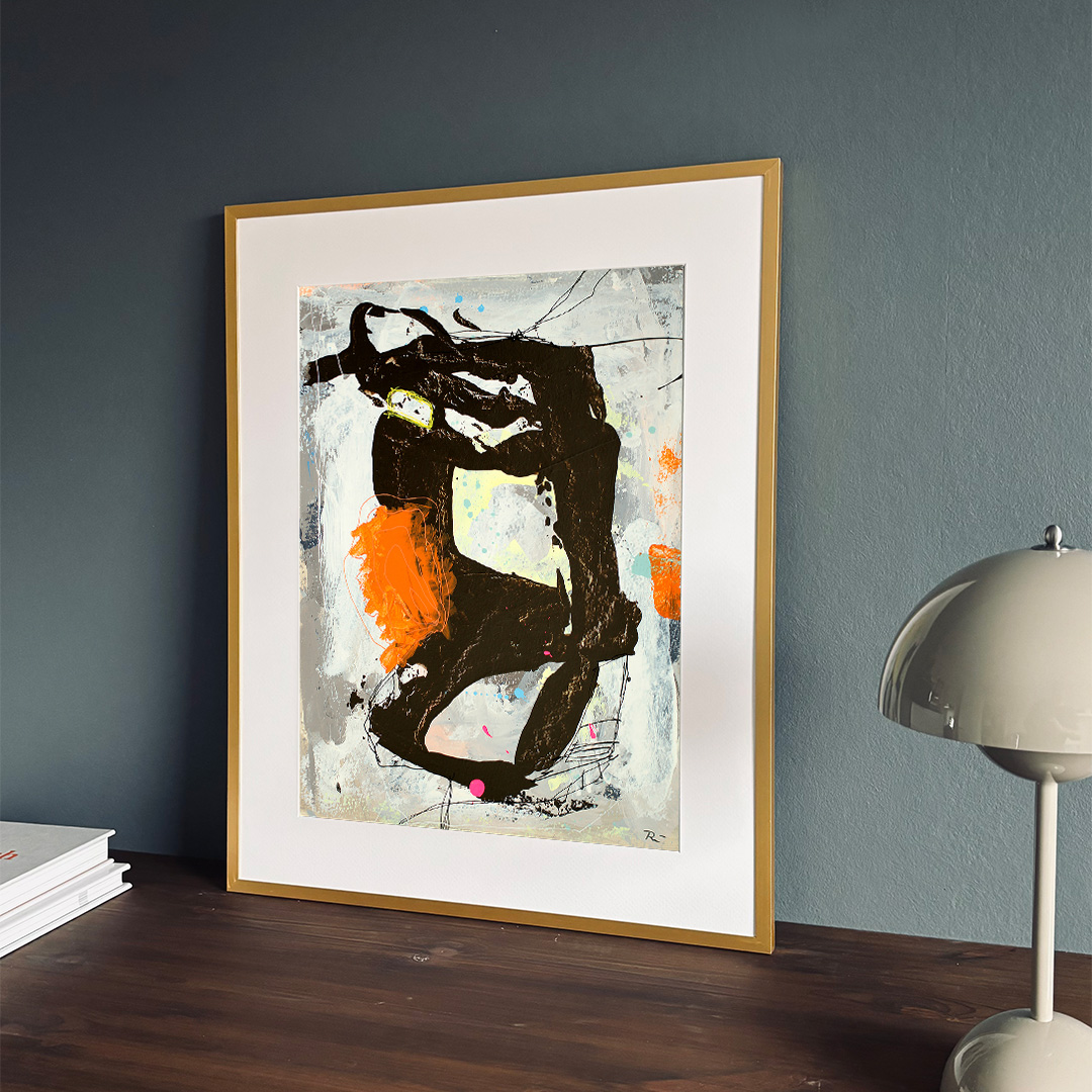 Original acrylic painting on paper in a beautiful brass-colored aluminum frame with passepartout. The front is made of plastic, which makes it safe to use. Bracket for hook on the back.