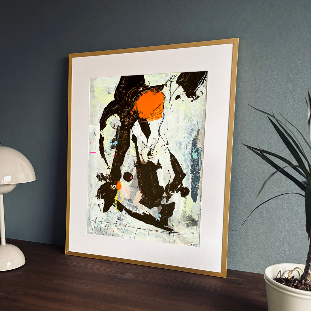 Original acrylic painting on paper in a beautiful brass-colored aluminum frame with passepartout. The front is made of plastic, which makes it safe to use. Bracket for hook on the back.