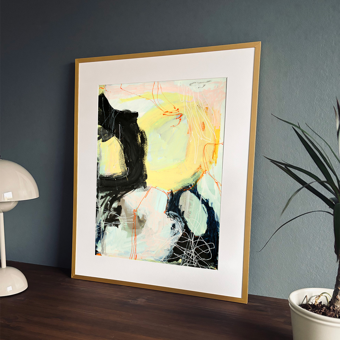 Original acrylic painting on paper in a beautiful brass-colored aluminum frame with passepartout. The front is made of plastic, which makes it safe to use. Bracket for hook on the back.