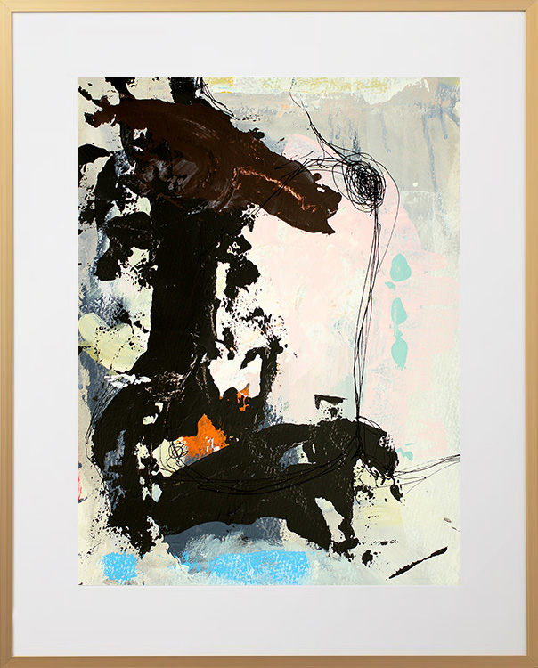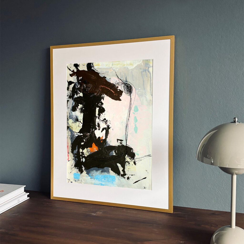 Original acrylic painting on paper in a beautiful brass-colored aluminum frame with passepartout. The front is made of plastic, which makes it safe to use. Bracket for hook on the back.