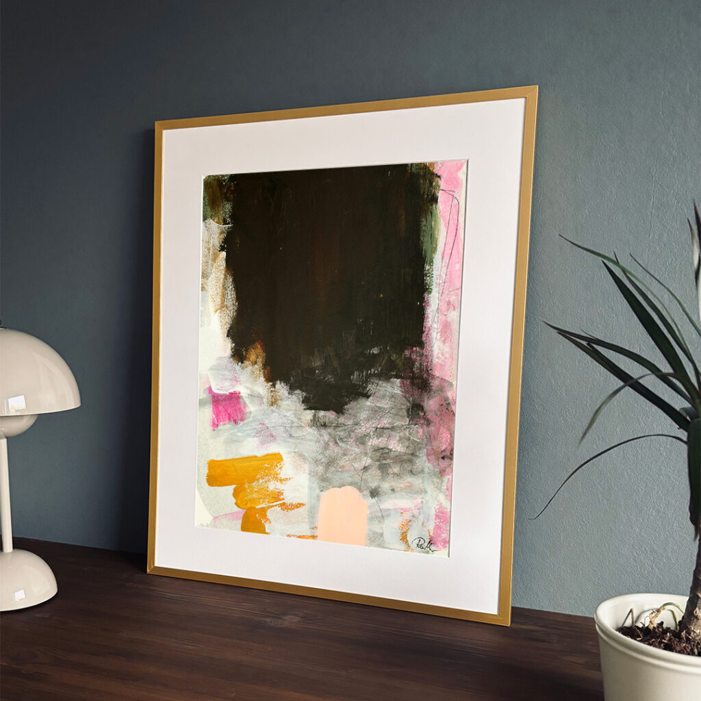 Original acrylic painting on paper in a beautiful brass-colored aluminum frame with passepartout. The front is made of plastic, which makes it safe to use. Bracket for hook on the back.